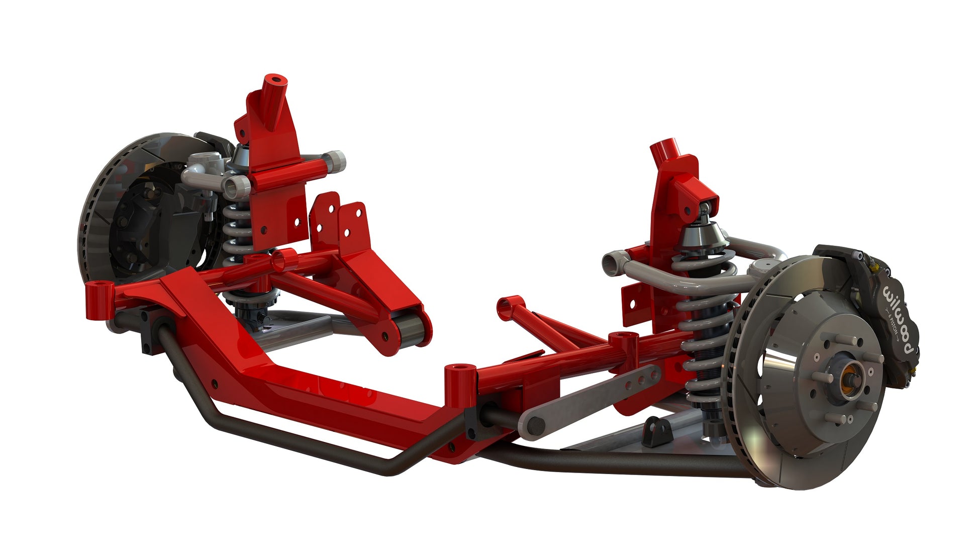 Heidts® 1968-1976 Mopar A-body Superide® II IFS kit. This complete kit comes with a Heidts Superide crossmember, adjustable control arms, standard or 2″ drop spindles, 11″ rotors with 4 piston Wilwood calipers, adjustable coilover shocks and a power steering rack. Brake upgrades, engine mounts and a swaybar are all available to upgrade. Standard spindles lower the car approximately an inch whereas the 2″ drop spindles will lower approximately 3″ from stock right height.