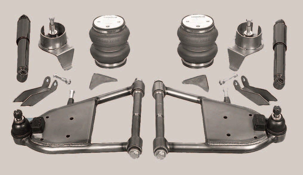 Now add air ride comfort and the ultimate in coolness to your muscle car or street rod with Heidts Air Shock Suspension System. You can cruise in the smoothest ride around to your rod run, and with just a touch of a button drop your street rod 2”-3”. When it is time to go home, just pump up the suspension and float on home. Heidts Air Shock Suspension System does it all. Kit includes shocks, upper shock mounts, upper air spring adapters, and air springs. *Control arms not included. Please use part number CA-114 for air ride control arm kit.