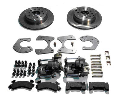 Moser 11.25" disc brake kit with parking brake. Kit features a 4.5" and 4.75" bolt pattern and uses 1/2" screw in studs. Works with all Heidts 4 link kits.